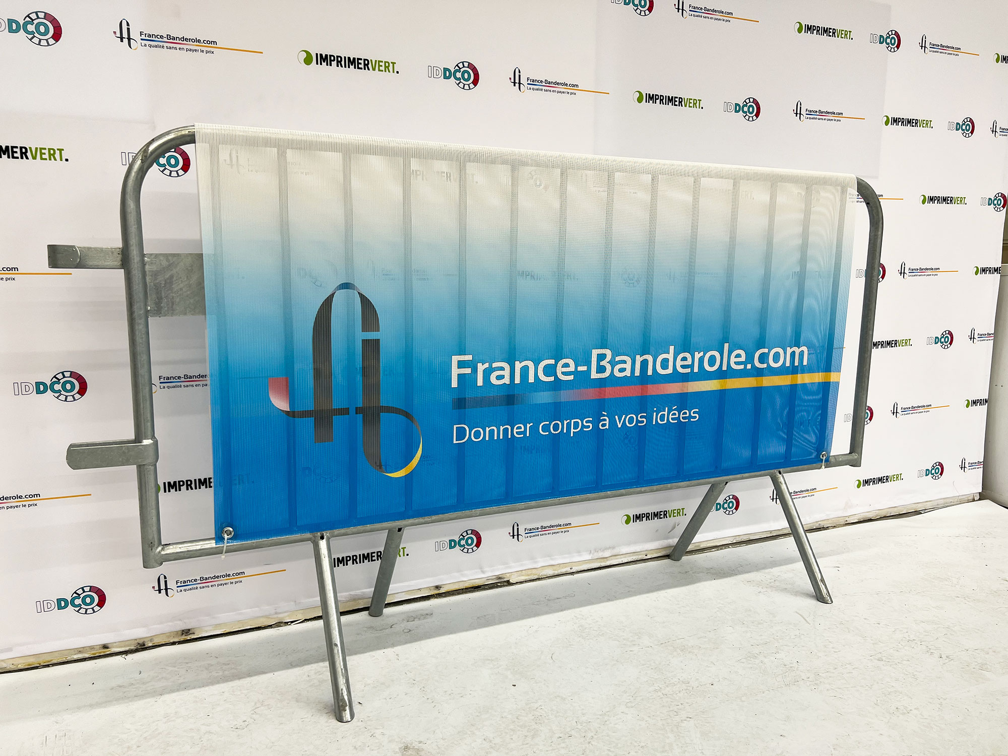 C’est un habillage entier que l’on pose par le dessus des barrières Vauban ou nadar. L’impression est donc composée de 2 visuels, un recto, l’autre verso. Ce support permet de créer une housse de barrière vauban qui permet de communiquer et de conserver toute la stabilité des barrières grace à sa structure. En effet, la bâche est de type grille ou Mesh ou Micro-perforée qui permet de résister à des vents forts. Son installation est tout aussi simple que la banderole cache-barrière. la banderole micro-perforée pour barrière Vauban se fixe grace à 4 ou 6 oeillets en fonction de la longueur de vos barrières de sécutité.