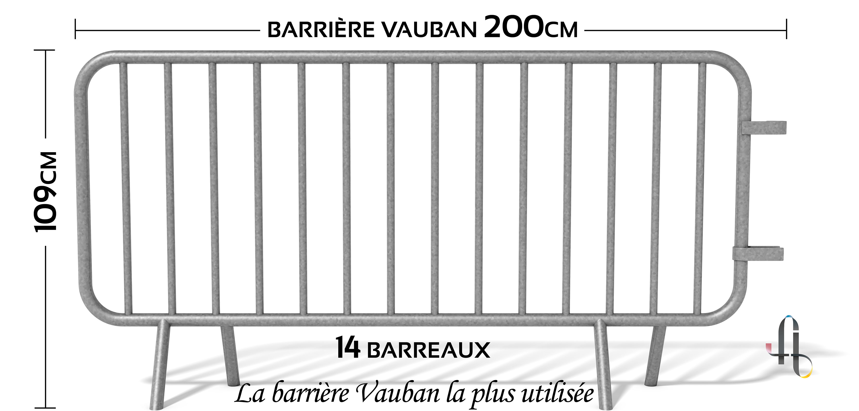 longueur 200 cm (barrière Vauban 14 barreaux la plus utilisée par les mairies, police et organisateurs d’événements culturels et sportifs. Façade de 188-190cm)